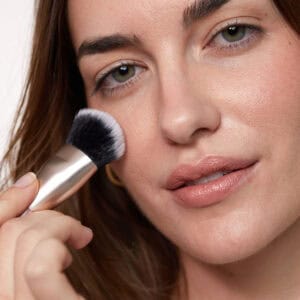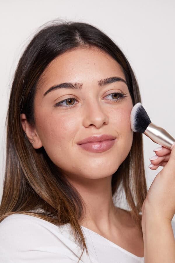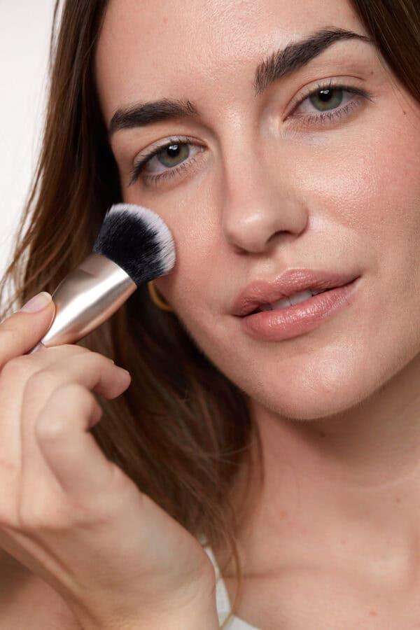 Gracias a la amplia forma de la parte grande de la brocha 01, repartimos la crema tostada de manera muy homogénea y en poco tiempo. La parte de dentro de la brocha ejerce presión para depositar el producto en la piel y la parte exterior, al ser el pelo más suelto, ayuda a difuminarlo e integrarlo en la piel.
