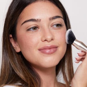 Gracias a la presión que ejerce la parte más pequeña de la brocha 01, aplicamos el colorete Soft Peach, añadiéndole cobertura desde la primera aplicación. Al ser una textura bálsamo, esta brocha adhiere el producto en la piel depositando más pigmento sin mucho esfuerzo.