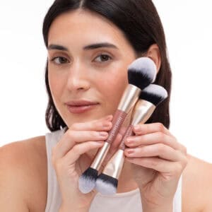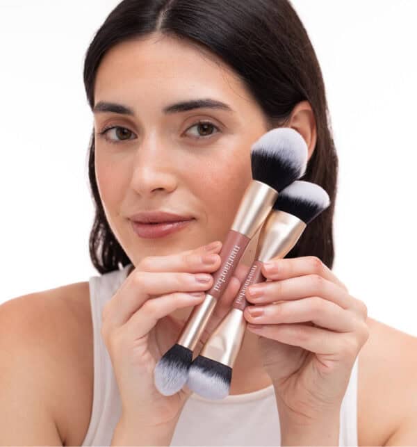 He creado estas brochas completamente desde cero buscando la máxima calidad. Gracias a mis más de 10 años en el sector, he podido descubrir la forma y el tipo de pelo que mejor funciona para aplicar todo tipo de productos en la piel y trabajarlos de manera muy fácil y sin esfuerzo. Además de añadirles más duración gracias a que los adhiere a la piel. Algo que también para mi es fundamental es que se lavan sin ningún esfuerzo gracias a la fibra que hemos elegido, lo que hará que mantengas tus brochas más limpias y los productos se trabajen mejor. Al ser una brocha doble te permite aplicar varios productos y sin necesidad de cambiar a otra. Tiene todo lo que necesitas en una.